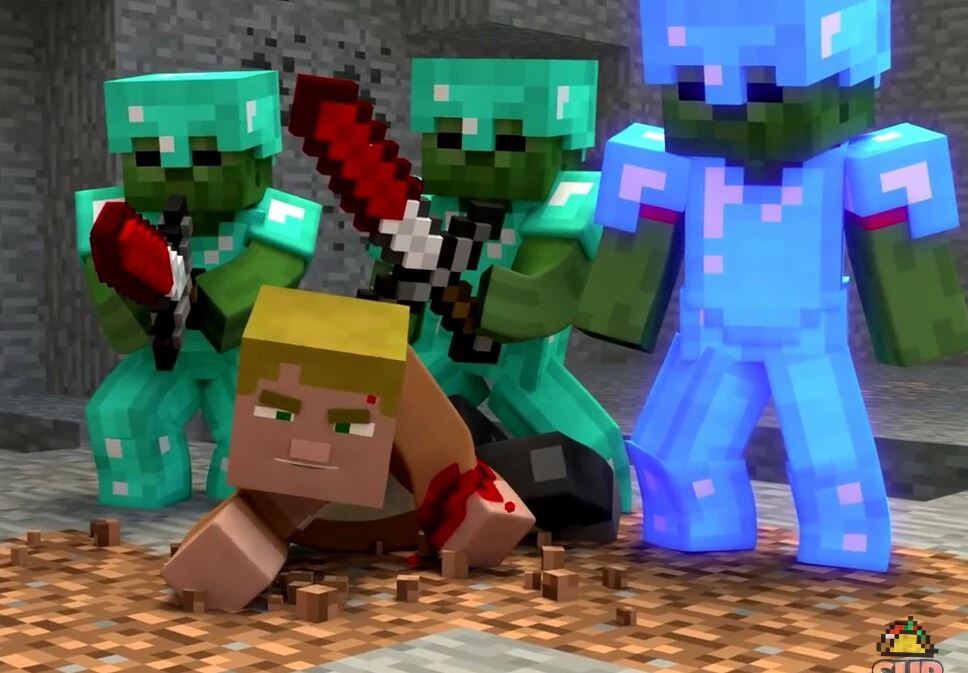 Shocked, Steve ponders how Zombies could do such actions and decides they had no other option but to engage. As Steve draws his diamond swords, Greg tells him and Chris to escape and that he would meet them at 'spawn', before being kicked in the face by the Red-Shirt Zombie. Steve yells and makes a move forward before Chris restrains him, telling Steve they need to go back and warn the "others". Chris suddenly notices two Creepers leap off the ledge above them and a Zombie throw a splash potion the Creepers, enraging them. Chris manages to push Steve away before the explosion makes contact.