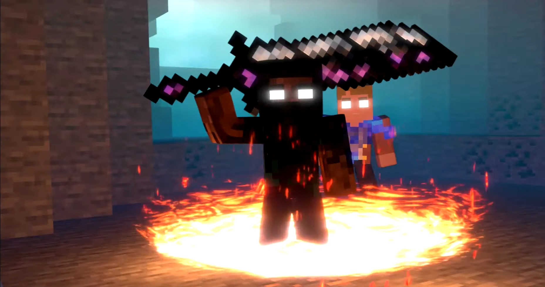 The fight resumed, with Battle Axe Herobrine leaping down from his alcove in an attempt to land a fatal blow. Blue Demon then swung the Legendary Sword and smashed Dark Herobrine against the stone wall, despawning him. The drowned then managed to get Netherite Herobrine with his special attack 'Electric Field'. The drowned swung his sword to finish him off, but the sword glowed a reddened shade of enchantment, rejecting the Blue Demon as his wielder.